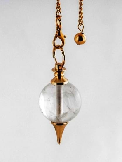 Pendel, Messing mit BergkristallkugelAus feinstem EdelstahlHandgemacht, ausgelesene KristalleMit vergoldeter Messingspitze und PendelketteHypnose-AadorfHeidelbergstr. 118355 AadorfTel. +41 52 534 12 01