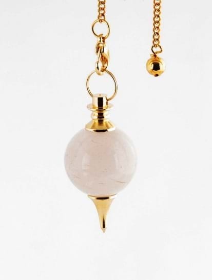 Rosenquarz-Kugelpendel mit MessingspitzeAus feinstem EdelstahlHandgemacht, ausgelesene KristalleMit vergoldeter Messingspitze und PendelketteHypnose-AadorfHeidelbergstr. 118355 AadorfTel. +41 52 534 12 01
