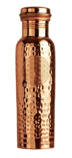 Diese handgehämmerte Kupferflasche mit eingravierter Blume des Lebens ist ein ganz besonders wertvoller Schatz für alle, die es lieben, reines und energetisch hochwertiges Wasser zu jeder Zeit zu trinken.