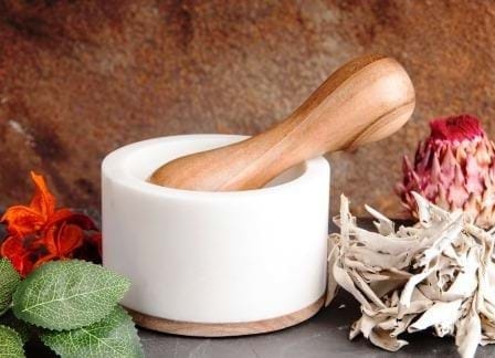 Liebevoll von Hand mit einem Mörser zerkleinerte Pflanzen sind immer einer elektrischen Mahlung vorzuziehen, da die Energie des Mahlenden mit einfliesst. Die Masse bekommt eine hohe Schwingung, wenn wir z.B. Mantras oder Gebete während des Mahlens rezitieren.