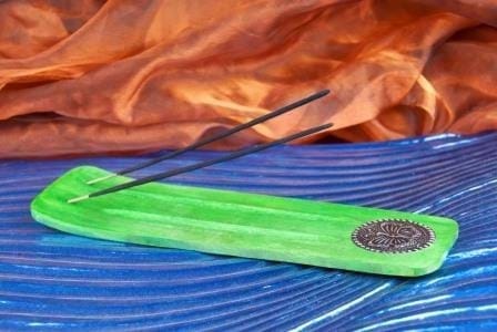 Farbenfrohe, dekorative superbreite Räucherhalter mit Messingemblem. Hier kann man gleich zwei Räucherstäbchen gleichzeitig abglimmen lassen und es fällt garantiert nichts daneben. Aus Mangoholz.